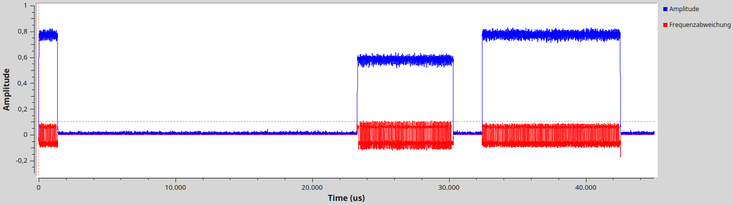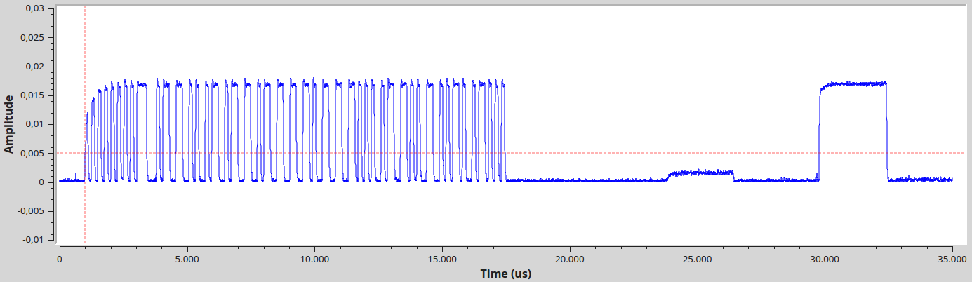 Leider konnten wir die beiden Signale nicht zeitsynchron aufzeichnen, also kann das Timing des Protokolls nicht ermittelt werden. Es fällt aber auf, dass beide Geräte im zweiten Sendeburst mit verringerter Intensität senden. Vermutlich handelt es sich hierbei um einen Intensitäts- oder Linearitäts-Test.
